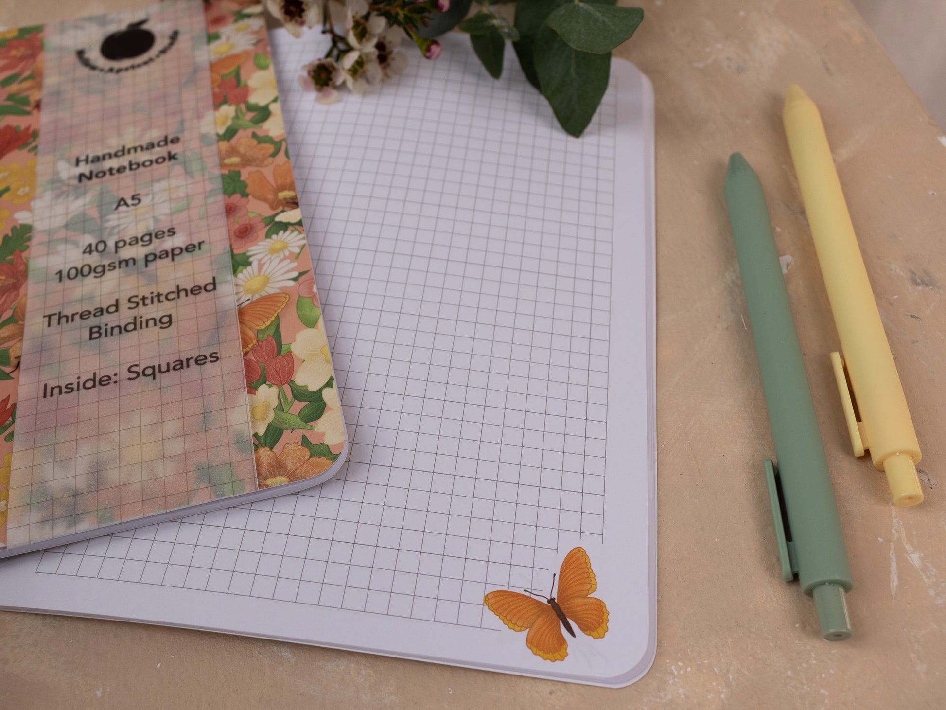 Add a pop of spring to your notes with our A5 handmade Spring Meadow notebook, featuring a vibrant design with flowers and insects. Choose from 4 different inners for all your writing needs.