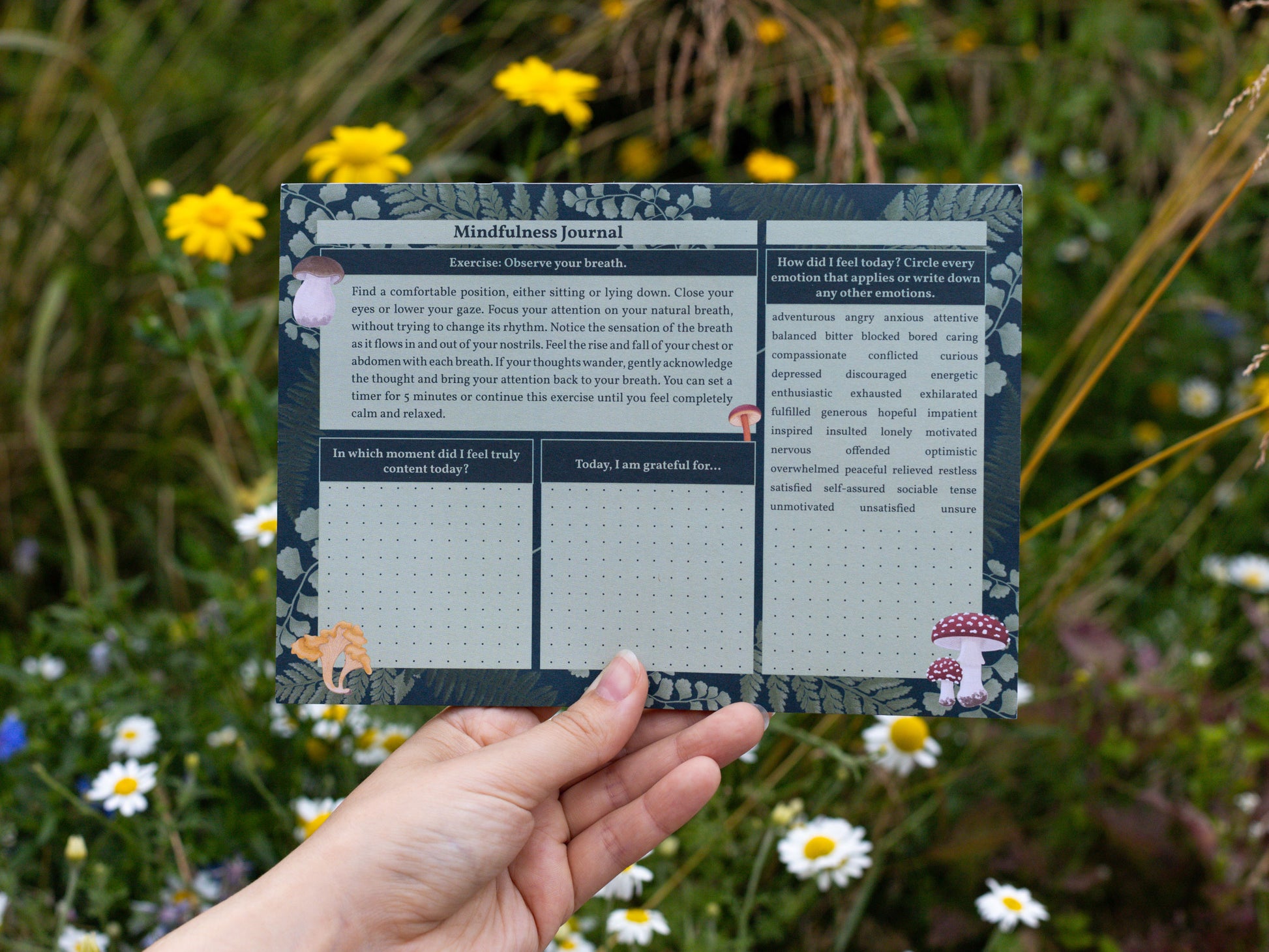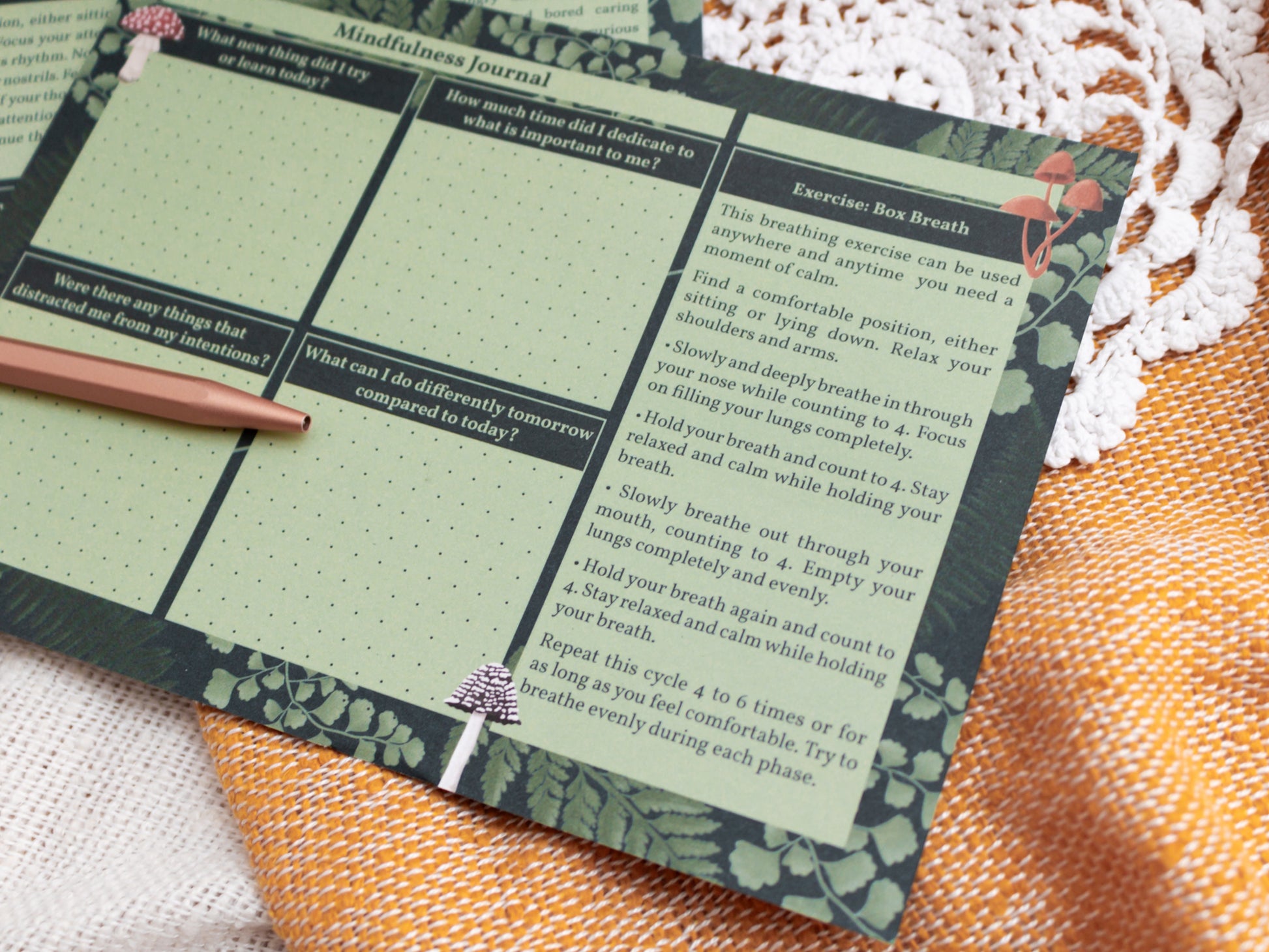 This Mindfulness Journal is your perfect companion to sit down and reflect on your day. It contains 2 breathing exercises and 7 mindfulness questions on it's double-sided pages. It doesn't matter if you use it daily, weekly or monthly, it's a great tool to get to know yourself. The design is in calming greens and features illustrated mushrooms to add some cosy feelings to your mindfulness practice.