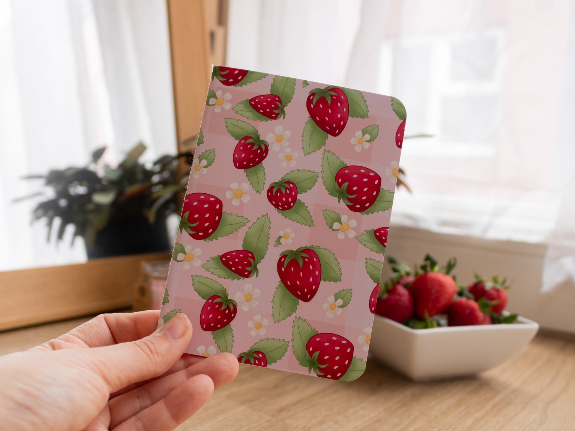 Welcome spring into your journalling life with this adorable strawberry picnic pattern handmade mini notebook.