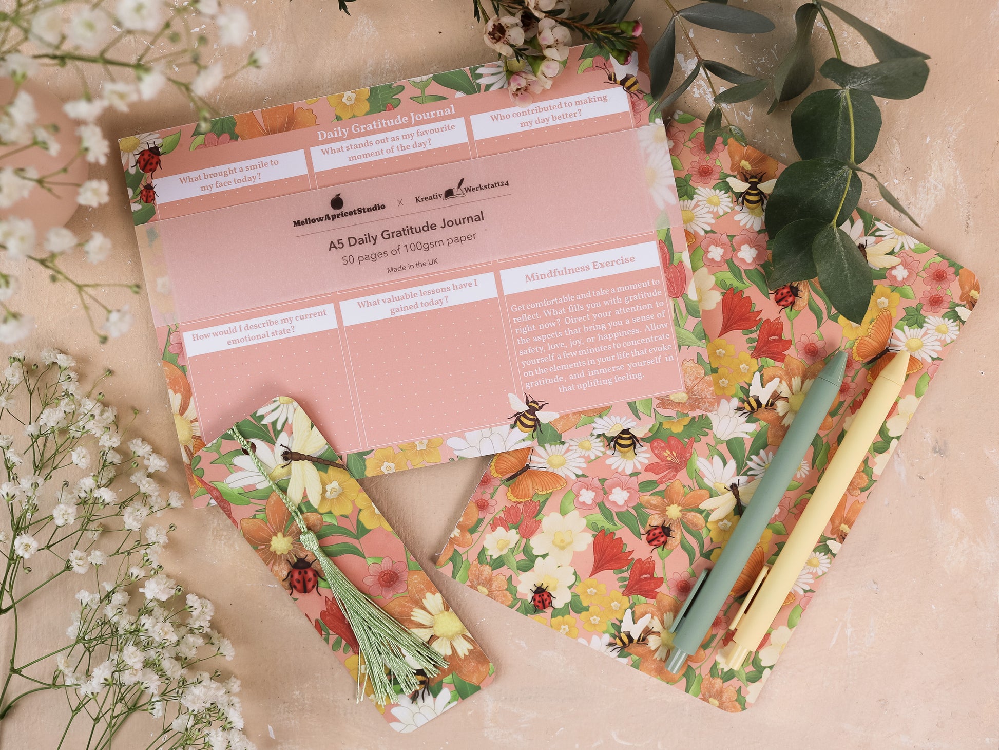 Find your inner peace with The Spring Meadow Mindfulness Bundle. This vibrantly designed set includes the A5 Gratitude Journal, A5 Handmade Notebook, and Bookmark with Tassel, all featuring the matching spring meadow design. Whether for yourself or a loved one, this bundle is a perfect gift to bring mindfulness and gratitude into your daily life.