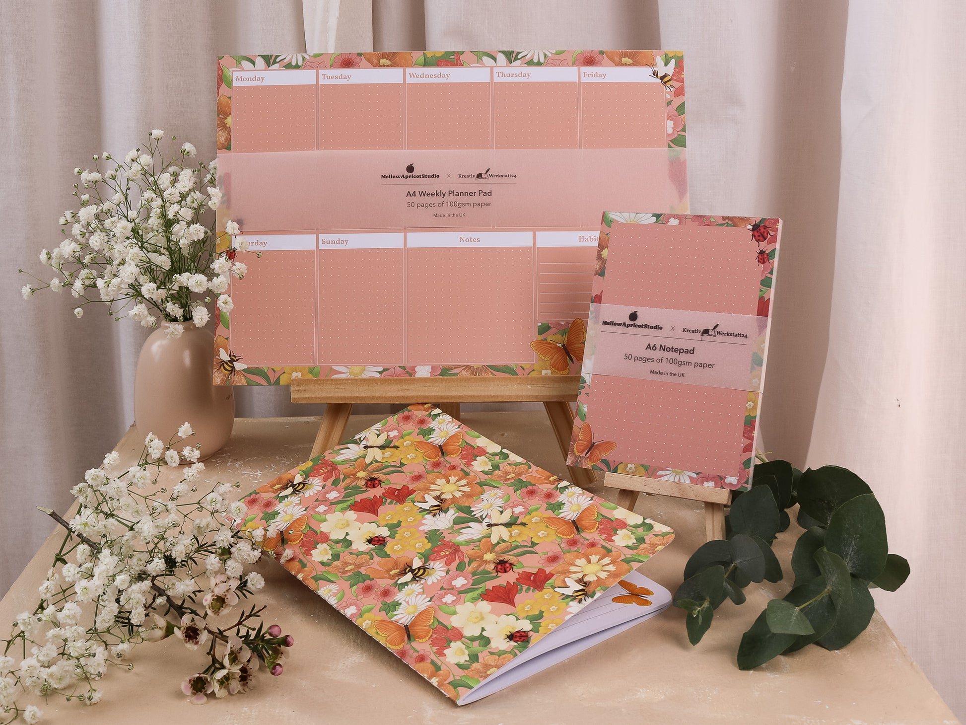 Get organised and inspired with The Spring Meadow Planner Bundle. This spring-inspired bundle features the A4 Weekly Planner Pad, the A5 Handmade Notebook, and the A6 Notepad, all in a vibrant spring meadow design with flowers and insects. Say goodbye to dull planning and hello to colorful productivity! You can gift this Planner Bundle to a friend or keept it for yourself!